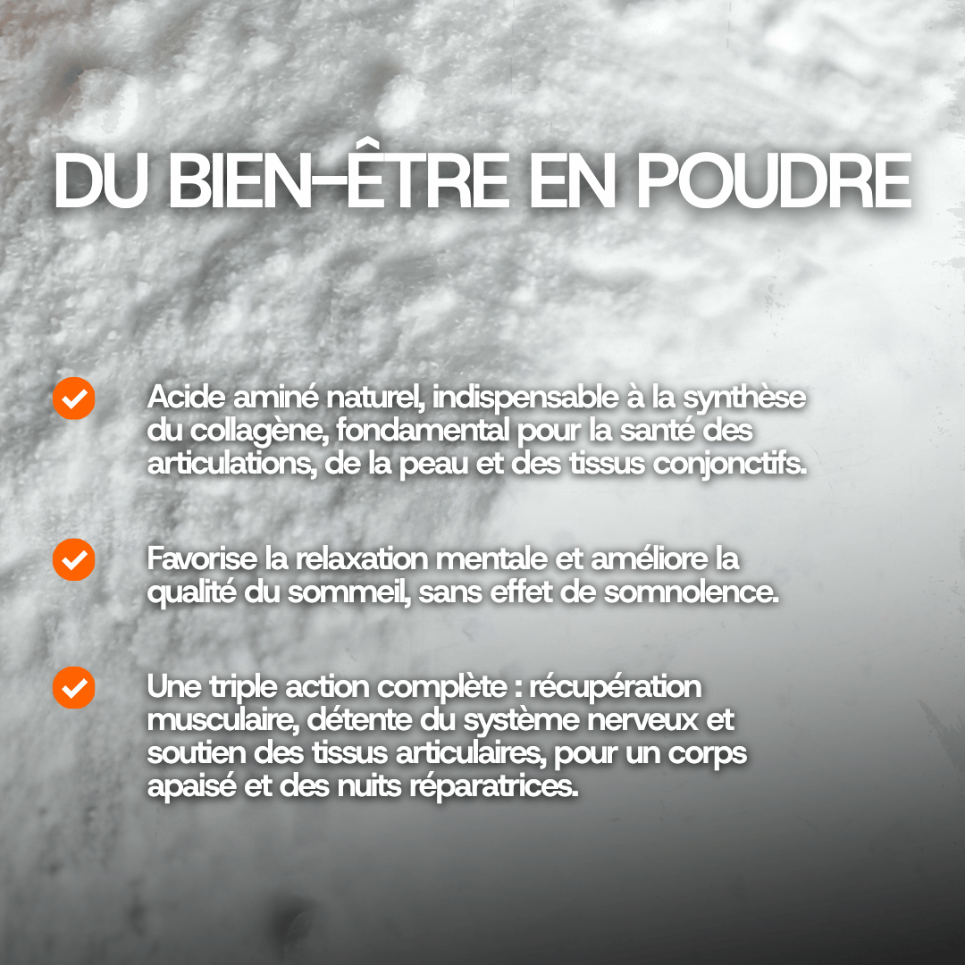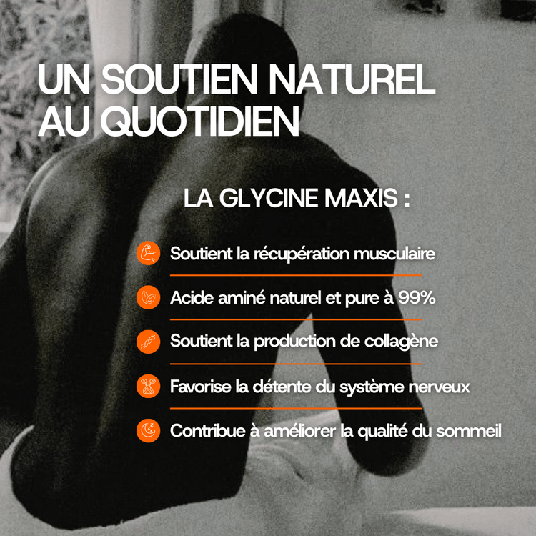 - Elle favorise la récupération musculaire. La Glycine intervient dans la synthèse de la créatine, un élément clé pour la contraction musculaire et la récupération après l'effort. Elle contribue également à la réparation des tissus musculaires sollicités pendant vos activités physiques intenses ou vos journées exigeantes.