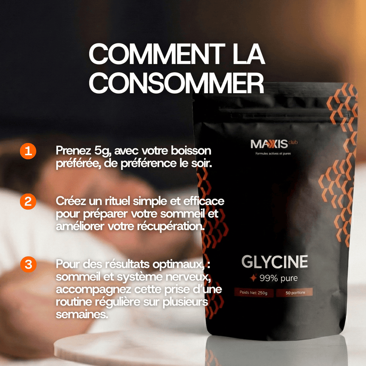 - Elle soutient le sommeil réparateur, sans somnolence dans la journée. Les études cliniques ont observé qu'une prise de 3g de Glycine avant le coucher était associée à une amélioration de la qualité du sommeil et à une réduction de la fatigue au réveil.